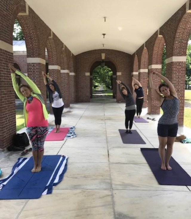 Between Memorial Day and Labor Day my vinyasa flow yoga classes are held outside, weather permitting, under the brick arcade of the Administration building.